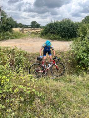 Groups faced by such crises, especially those occurring tantalisingly close to tea and cake, are in need of strong and decisive leadership. In the absence of this, it is good to have Alex on board. Calling on his encyclopedic knowledge of the lanes and byways of Hertfordshire (and beyond) he pointed out a farm track to our left that would take us on our way. There was, though, the small matter of a deep, sheer-sided ditch between us and our escape route. My leadership skills surfaced at this point. Surely the captain should be the last to leave? So, I waited until the others had crossed unscathed before having a go myself. It occurred to me that if I placed my bike in the ditch it would be a useful prop with which to steady myself on the descent. This might have worked well had not my left foot been lassooed by a bramble. I think it was at this point that Brian helpfully took a photograph.