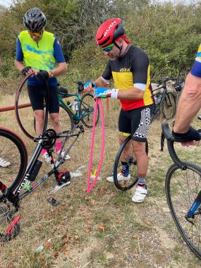 We had our one and only puncture just after this final stop. Whilst repairing it Enzo produced a bright pink inner tube which was greeted with much interest by the group. As we set off again Enzo’s cleat mould came off for about the 100th time but no one cared as he had ‘a pink inner tube’!!